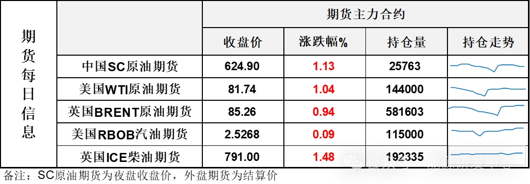 【1】WTI主力原油期貨收漲0.84美元,漲幅1.04%,報(bào)81.74美元/桶;布倫特主力原油期貨收漲0.79美元,漲幅0.94%,報(bào)85.26美元/桶;INE原油期貨收漲1.13%,報(bào)624.9元。