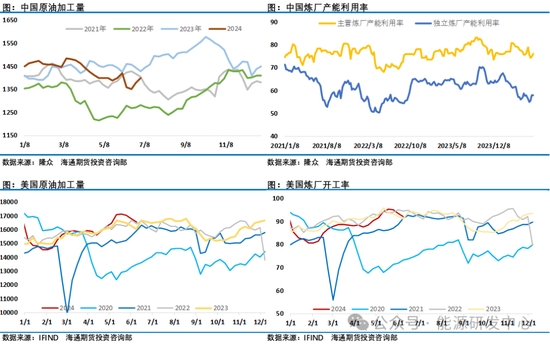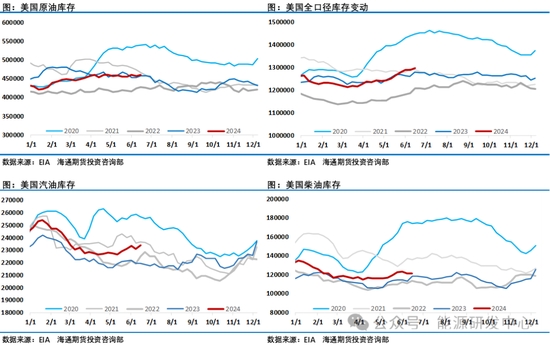 這輪油價(jià)上漲背后最初有超跌反彈的修復(fù)需求,有供需層面從5月底的糟糕局面中改善,有地緣因素帶來(lái)的供應(yīng)擔(dān)憂,有投機(jī)資金平倉(cāng)空單回補(bǔ)凈多頭寸的推力,另外這輪油價(jià)上行背景是有色金屬、黑色金屬等工業(yè)品持續(xù)回落階段,從走勢(shì)上可以看出原油跟其他工業(yè)品走出了背離的行情,這也推動(dòng)了資金多原油空其他工業(yè)品的配置,資金行為進(jìn)一步放大了油價(jià)的強(qiáng)勢(shì)。可以看出這輪油價(jià)能反彈10美元是多重因素形成合力的結(jié)果,雖然從產(chǎn)業(yè)視角對(duì)油價(jià)如此表現(xiàn)有偏離供需的判斷,但還是能看出資金對(duì)油價(jià)看漲的力量還是占據(jù)了明顯優(yōu)勢(shì),原油月差大幅走強(qiáng),WTI1-3月差甚至刷新了年內(nèi)高點(diǎn),成品油裂解差在這波反彈過(guò)程表現(xiàn)較為平穩(wěn),供應(yīng)端繼續(xù)貢獻(xiàn)了主要的推漲力量。原油市場(chǎng)需求端仍沒(méi)有出現(xiàn)讓油價(jià)大幅走強(qiáng)的變化,尤其是作為原油最大進(jìn)口國(guó),在2024年需求增量上被歐佩克寄予了厚望的中國(guó)市場(chǎng),過(guò)去一段時(shí)間成品油表現(xiàn)跟上游強(qiáng)勢(shì)原油完全脫節(jié),一方面是國(guó)內(nèi)投資者信心處于低位,另一方面國(guó)內(nèi)成品油消費(fèi)被替代力度超預(yù)期疊加自身需求較弱也是進(jìn)一步加劇了市場(chǎng)悲觀情緒。另外一個(gè)市場(chǎng)高度關(guān)注的美國(guó)市場(chǎng)從今年其汽柴油消費(fèi)來(lái)看也是明顯低于去年同期表現(xiàn)。在這種背景下三季度原油市場(chǎng)傳統(tǒng)的消費(fèi)旺季成了市場(chǎng)的希望,目前來(lái)看大部分機(jī)構(gòu)對(duì)此還是抱有非常高的期待,并判斷三季度原油市場(chǎng)將出現(xiàn)明顯的供應(yīng)短缺,能否如期兌現(xiàn)接下來(lái)時(shí)間將給出答案。