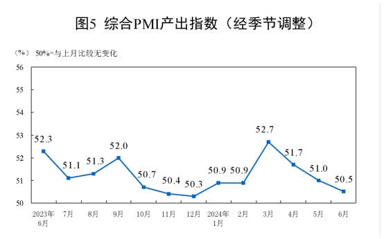 6月份,綜合PMI產(chǎn)出指數(shù)為50.5%,比上月下降0.5個百分點,高于臨界點,表明我國企業(yè)生產(chǎn)經(jīng)營活動總體繼續(xù)保持?jǐn)U張。