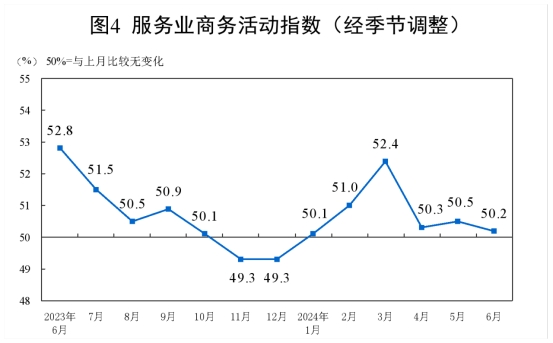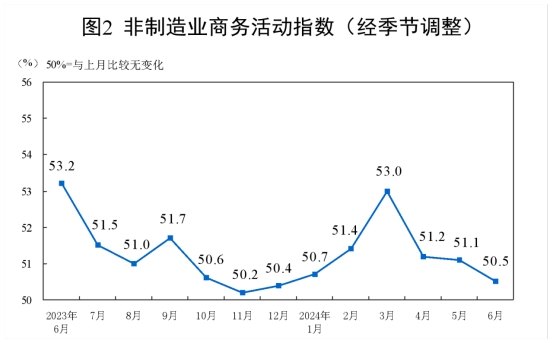 6月份,非制造業(yè)商務(wù)活動指數(shù)為50.5%,比上月下降0.6個百分點,高于臨界點,非制造業(yè)繼續(xù)保持?jǐn)U張。