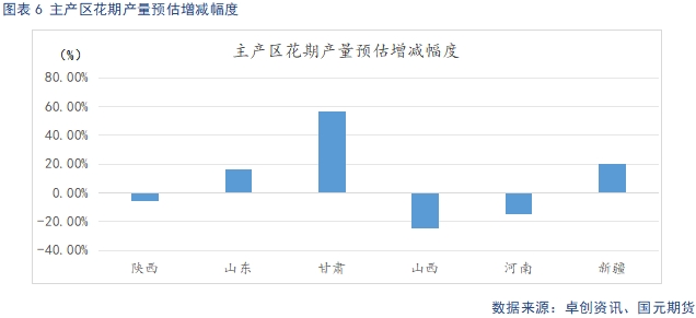 據(jù)卓創(chuàng)資訊對(duì)坐果期套袋調(diào)研,新季各產(chǎn)區(qū)有增有減。整體來(lái)看,2024年預(yù)估產(chǎn)量3871萬(wàn)噸,較2023年3557萬(wàn)噸的產(chǎn)量,增產(chǎn)8.98%。今年花期,氣候條件良好,果面質(zhì)量和果個(gè)較去年均有上升,后續(xù)仍需關(guān)注生長(zhǎng)期天氣狀況,如未遭遇干旱、冰雹等自然災(zāi)害的影響,實(shí)際產(chǎn)量會(huì)比預(yù)估進(jìn)一步上調(diào)。