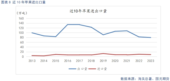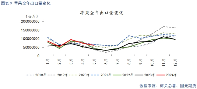 據(jù)海關(guān)總署數(shù)據(jù)顯示,24年1-5月,我國(guó)蘋(píng)果累計(jì)出口量為36.8萬(wàn)噸,較去年同比上漲30.96%。同比增幅明顯,在歷年出口數(shù)據(jù)中處于較高水平。主要是適合出口的貨源價(jià)格持續(xù)走弱,成本優(yōu)勢(shì)明顯。今年以來(lái),我國(guó)蘋(píng)果出口數(shù)據(jù)表現(xiàn)亮眼,不過(guò)我國(guó)每年出口量占總產(chǎn)能的比例在2-3%左右,鮮果消費(fèi)主要還是依靠?jī)?nèi)需,在內(nèi)需低迷的大背景下,外貿(mào)向好對(duì)蘋(píng)果支撐力度有限。