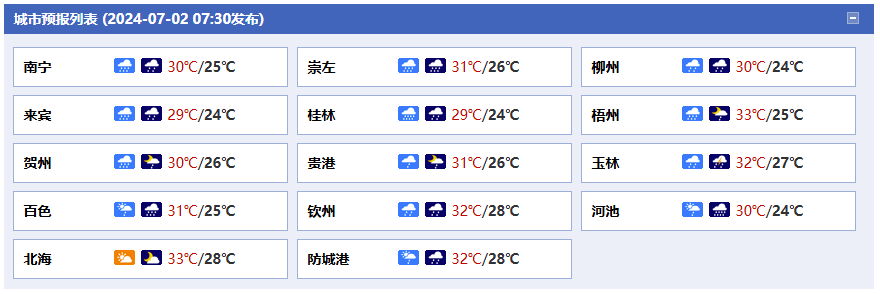 南寧市:今天白天大雨、局地暴雨,今天晚上中雨、局地大雨,偏南風2~3級,最高氣溫30℃,最低氣溫25℃。