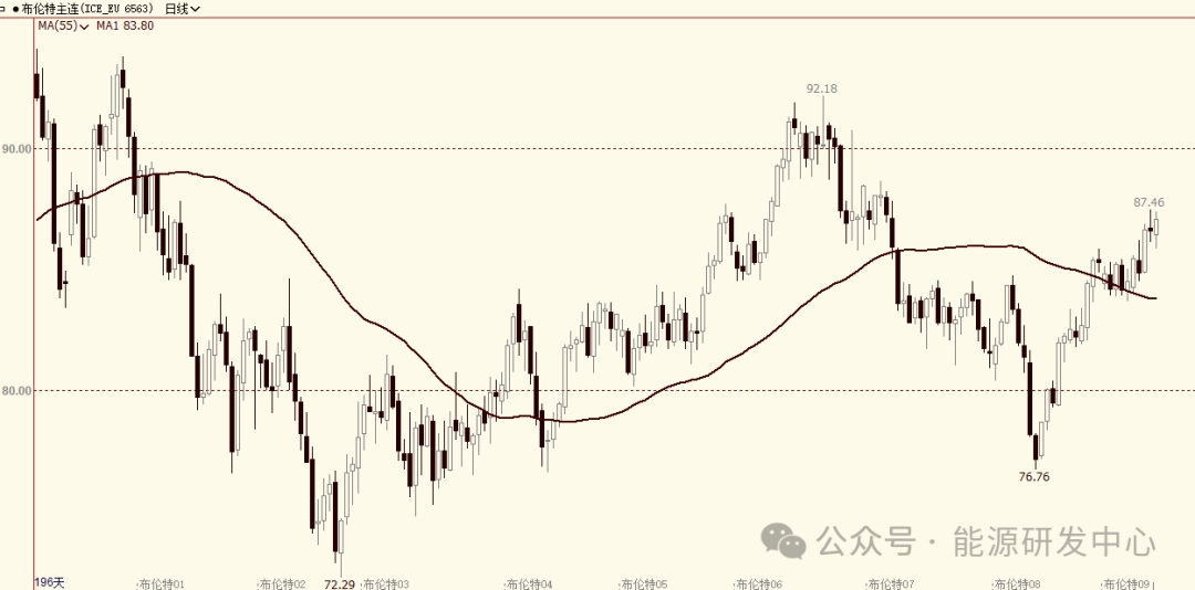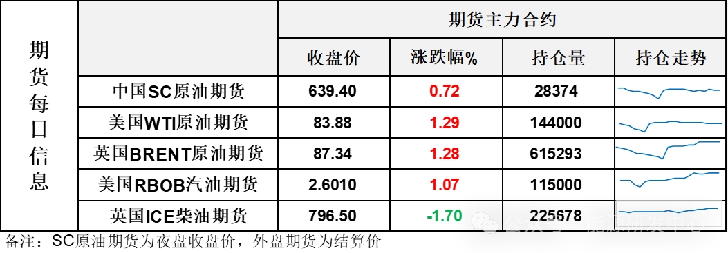 【1】WTI主力原油期貨收漲1.07美元,漲幅1.29%,報(bào)83.88美元/桶;布倫特主力原油期貨收漲1.1美元,漲幅1.28%,報(bào)87.34美元/桶;INE原油期貨收漲0.72%,報(bào)639.4元。