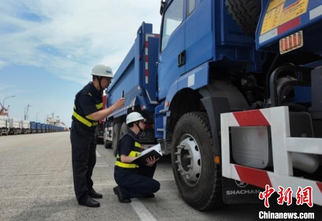 6月21日,吳淞海關(guān)關(guān)員對(duì)出口至共建“一帶一路”國(guó)家的工程車(chē)輛進(jìn)行監(jiān)管