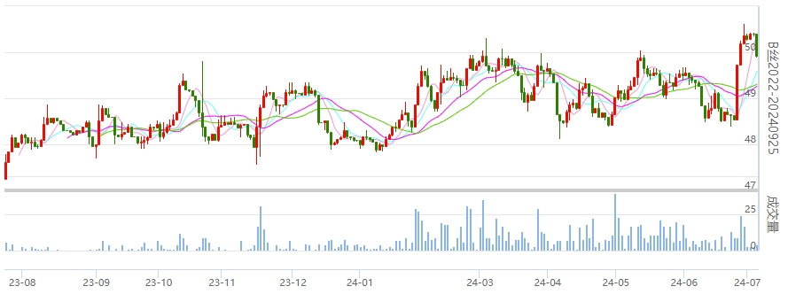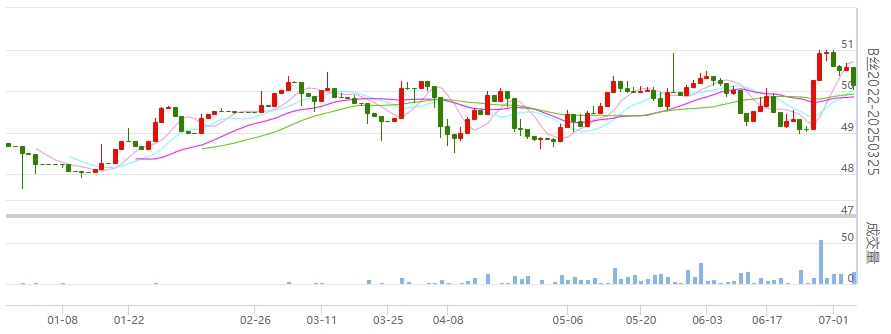 今日(2024年07月04日,周四)中國繭絲綢交易市場生絲電子指數(shù)下跌0.24%報5010.99點(diǎn)。B絲2022D(商檢4A級生絲):240725合約下跌0.06萬元報收于50.22萬元;240925合約下跌0.48萬元報收于49.92萬元;250325合約下跌0.42萬元報收于50.16萬元。B絲40/44-240725合約報平收48.42萬元;A絲20/22-240725合約上漲0.03萬元報51.75萬元。(更多行情詳情到首頁進(jìn)行查看)