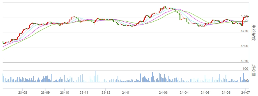 今日(周四)20/22D商檢4A級生絲:整體各遠(yuǎn)近合約多收綠,主力合約下跌幅度相對較大些,成交量較昨日有所放大。今日生絲指數(shù)收于5日均線下方。