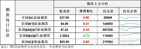 【1】因假期歐美市場提前停盤,WTI主力原油期貨收漲0.18美元,漲幅0.21%,報84.06美元/桶;布倫特主力原油期貨收漲0.09美元,漲幅0.1%,報87.43美元/桶;INE原油期貨收漲0.6%,報637.6元。