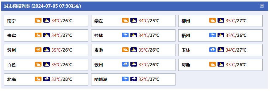 南寧市:今天白天到晚上,多云、午后局地有陣雨或雷雨,偏南風2級,最高氣溫34℃,最低氣溫26℃。
