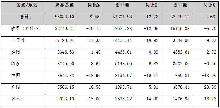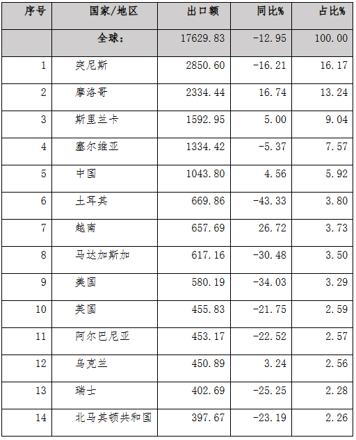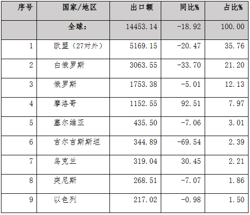 在主要市場中,除對摩洛哥和烏克蘭出口大幅增長外,對其他主要市場出口均下降。