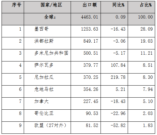對前三大市場中國、越南、泰國出口額均下降,降幅均超過了10%。由于對中、越、泰出口額合計占比在80%以上,雖對多米尼加和歐盟出口有所增長,但基數(shù)小,占比低,難以扭轉(zhuǎn)整個出口下降的局面(詳見表7)。