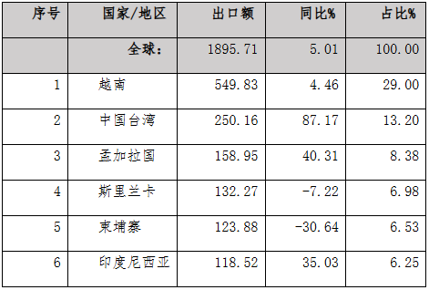 在主要市場中,對越南出口占比最大,為29%,增幅4.46%,對中國臺灣地區(qū)和孟加拉出口大幅增長,增幅分別為87.17%和40.31%(詳見表8)。