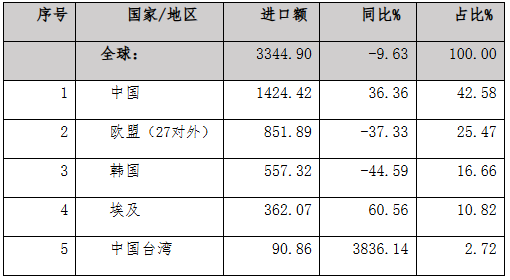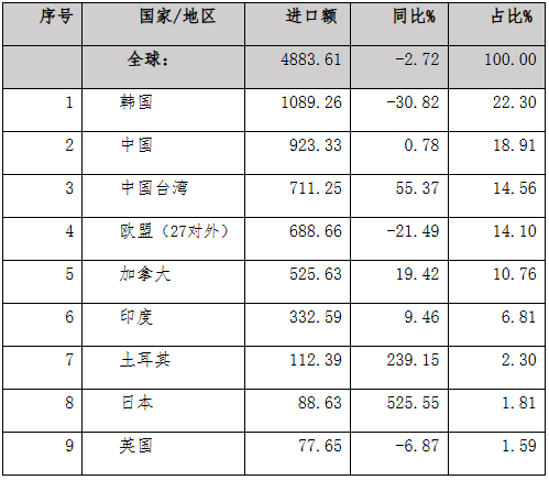自前5個主要進口來源地進口額占比均超過10%,合計占比達80.63%。從韓國、歐盟進口下滑明顯,從中國、中國臺灣地區(qū)、加拿大進口均有所增長(詳見表10)。