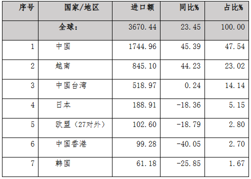 自主要來源地中國、越南和中國臺灣進口額合計3109萬美元,占比達84.7%。其中,自中國、越南進口分別增長45.39%和44.23%,自中國臺灣進口基本與上年度同期持平(詳見表12)。