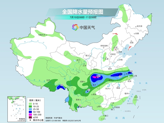 明天開始,雨帶將隨著副熱帶高壓南北擺動(dòng)。預(yù)計(jì)明天至13日,雨帶西段維持在四川盆地、西北地區(qū)東南部,雨帶東段南壓至江淮一帶。