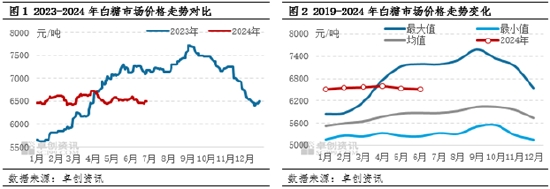 2024年上半年白糖市場(chǎng)運(yùn)行的低點(diǎn)出現(xiàn)在2月下旬,價(jià)格達(dá)到6430元/噸;高點(diǎn)出現(xiàn)在4月初,價(jià)格達(dá)到6730元/噸。2024年上半年價(jià)格振幅4.67%,較上年同期收窄25.22個(gè)百分點(diǎn)。上半年加工糖價(jià)格整體偏高,進(jìn)口壓力尚未集中釋放,國(guó)產(chǎn)糖存在一定價(jià)格優(yōu)勢(shì),糖廠銷售進(jìn)度較好。但隨著國(guó)際糖價(jià)不斷下跌以及國(guó)內(nèi)糖產(chǎn)量增加事實(shí)明確,糖廠庫(kù)存整體高于去年同期水平,疊加市場(chǎng)消費(fèi)不及預(yù)期,導(dǎo)致糖價(jià)承壓回落。