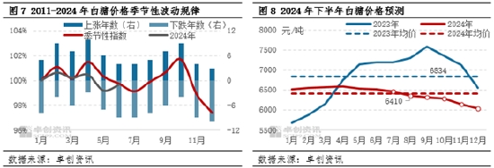 綜合上述分析,卓創(chuàng)資訊對(duì)《2023-2024中國(guó)白糖市場(chǎng)年度報(bào)告》中關(guān)于下半年的趨勢(shì)預(yù)測(cè)進(jìn)行修正,將年報(bào)中先高后低的價(jià)格趨勢(shì)預(yù)估修正為震蕩下行。預(yù)計(jì)2024年下半年廣西南寧白糖主流價(jià)格運(yùn)行區(qū)間或在6000-6600元/噸,高點(diǎn)大概率出現(xiàn)在7月份,低點(diǎn)或出現(xiàn)在12月份(具體價(jià)格預(yù)測(cè)參考圖8)。