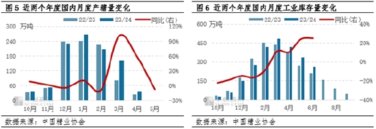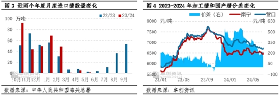從國(guó)內(nèi)糖廠庫(kù)存變化的季節(jié)性規(guī)律來看,一般每年3月糖廠工業(yè)庫(kù)存量達(dá)到全年峰值狀態(tài)。雖然3月開始主產(chǎn)區(qū)糖廠陸續(xù)收榨,但生產(chǎn)高峰期的三個(gè)月(2023年12月-2024年2月)單月產(chǎn)量均在200萬噸以上,糖廠庫(kù)存不斷累積。由于今年主產(chǎn)區(qū)糖廠收榨進(jìn)度偏慢,3月糖產(chǎn)量同比增幅較大,庫(kù)存累積壓力顯現(xiàn),疊加加工糖和國(guó)產(chǎn)糖的價(jià)差不斷收窄,國(guó)產(chǎn)糖走貨優(yōu)勢(shì)逐步減弱,3月開始糖廠庫(kù)存消耗進(jìn)度放緩。截至6月底,2023/24年度全國(guó)糖廠工業(yè)庫(kù)存260萬噸左右,同比增加24.4%。