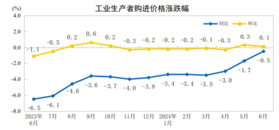 2024年6月份,全國工業(yè)生產(chǎn)者出廠價格同比下降0.8%,降幅比上月收窄0.6個百分點,環(huán)比由上月上漲0.2%轉(zhuǎn)為下降0.2%;工業(yè)生產(chǎn)者購進價格同比下降0.5%,環(huán)比上漲0.1%。上半年,工業(yè)生產(chǎn)者出廠價格比上年同期下降2.1%,工業(yè)生產(chǎn)者購進價格下降2.6%。