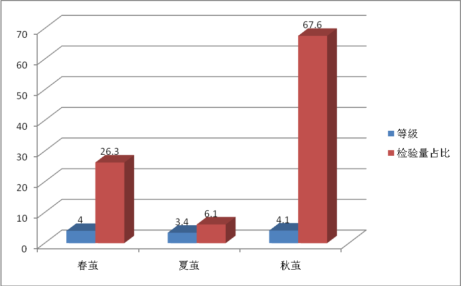 公證檢驗(yàn)共涉及春、夏、秋季共3個(gè)繭期,春繭為65批次,檢驗(yàn)量占比例為26.3%,等級(jí)為4A;夏繭為15批,檢驗(yàn)量占比例為6.1%,等級(jí)為3.4A;秋繭為167批,檢驗(yàn)量占比例為67.6%,等級(jí)為4.1A(詳見圖6)。