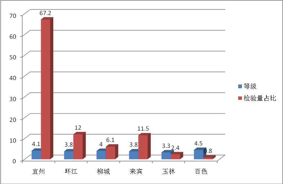 公證檢驗(yàn)共涉及到河池的宜州、環(huán)江及柳城、來賓、玉林和百色共6個(gè)地區(qū),各原料地等級(jí)分別為:宜州為4.1A,檢驗(yàn)量占比例為67.2%;環(huán)江為3.8A,檢驗(yàn)量占比例為12.0%;柳城為4A,檢驗(yàn)量占比例為6.1%;來賓為3.8A,檢驗(yàn)量占比例為11.5%;玉林為3.3A,檢驗(yàn)量占比例為2.4%;百色為4.5A,檢驗(yàn)量占比例為0.8%。