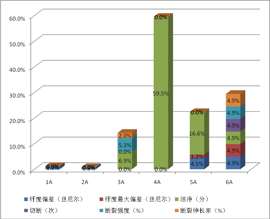 根據(jù)GB/T 1797《生絲》分級(jí)規(guī)定,生絲外觀檢驗(yàn)結(jié)果均為有三個(gè)稍劣降級(jí);主要檢驗(yàn)項(xiàng)目中的潔凈和纖度偏差,其他檢驗(yàn)項(xiàng)目中的斷裂強(qiáng)度指標(biāo)為主要定級(jí)指標(biāo),以上指標(biāo)綜合定級(jí)率分別為:纖度偏差10.5%、纖度最大偏差6.1%、潔凈89.1%、切斷4.9%、斷裂強(qiáng)度10.1%、斷裂伸長(zhǎng)率6.9%、抱合4.9%(詳見圖4)。