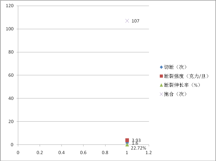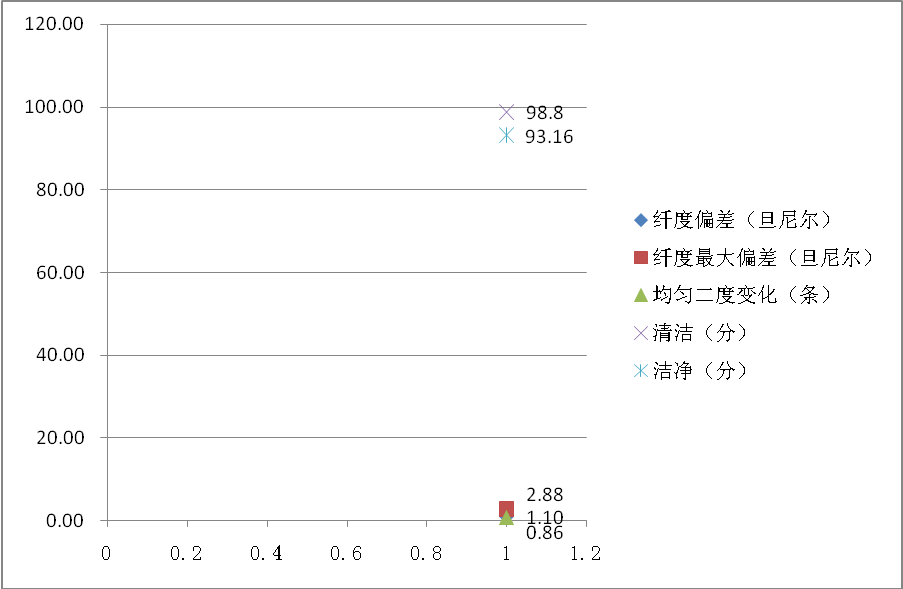 根據(jù)GB/T 1797《生絲》品質(zhì)指標(biāo)規(guī)定,主要檢驗(yàn)項(xiàng)目的平均結(jié)果分別為:纖度偏差1.10旦尼爾、纖度最大偏差2.88旦尼爾、均勻二度變化0.86條、清潔98.8分、潔凈93.16分(詳見圖2);其他檢驗(yàn)項(xiàng)目的平均結(jié)果分別為:斷裂強(qiáng)度3.93克力/旦、斷裂伸長(zhǎng)率22.72%、抱合107次(詳見圖3)。