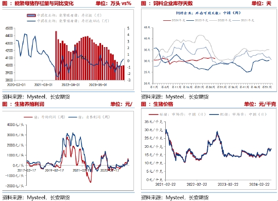 農(nóng)業(yè)農(nóng)村部數(shù)據(jù),2024年5月末能繁母豬存欄量為3996萬頭,環(huán)比增加0.25%,同比下降4.7%,相比2022年12月份高位時的4390萬頭已經(jīng)下降了8.9%。按照10個月的出欄周期,自2023年10月開始生豬出欄將逐步降低。在生豬去產(chǎn)能背景下,生豬飼料需求穩(wěn)中降低或為大方向,不利于玉米價格走強。當下,生豬供需關系進一步改善,豬價偏強養(yǎng)殖利潤顯著改善,在此背景下,農(nóng)業(yè)農(nóng)村部數(shù)據(jù)顯示能繁母豬自5月開始增加,鋼聯(lián)數(shù)據(jù)顯示能繁母豬存欄自3月增加,飼料需求有所增加。后期,在利潤提振下,生豬存欄也有望止降回升。禽類養(yǎng)殖方面,雞蛋(4023, 11.00, 0.27%)價格回升,蛋雞養(yǎng)殖維持盈利,存欄持續(xù)增加。在此背景下,飼料企業(yè)玉米庫存天數(shù)31.15天,周環(huán)比小幅降低,同比仍偏高。我國5月飼料產(chǎn)量小幅增加至2569.6萬噸,去年同期為2570萬噸,同比差距不大。