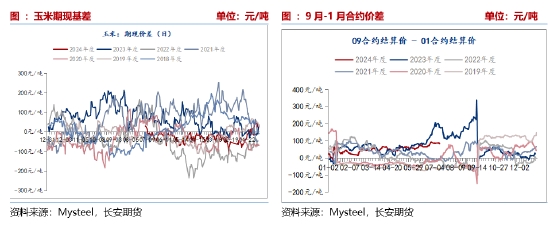 7月12日,錦州港口玉米與2409合約基差約為31元/噸,扭轉今年以來長期負基差狀態(tài),由于期貨盤面回吐前期天氣升水。不過,基于當前連盤倉單中性偏高、當下供應不及預期寬松以及產(chǎn)銷倒掛的局面,接貨存在風險,盤面或持續(xù)承壓于偏空的基本面。而經(jīng)過半個多月的期價下跌,盤面已具備做多的中長期價值,但缺乏上行驅動,短期或承壓運行,正基差有望維持。2023年10月以來,9-1價差持續(xù)保持正值,且5-9價差持續(xù)負值,暗示玉米供需進一步寬松。疊加考慮新作種植成本降低,9-1正套或仍有盈利空間。