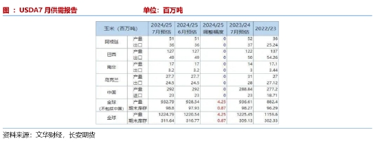 雖然洪澇與干旱并存,但6月底美國農(nóng)業(yè)部公布種植面積報告和季度庫存報告顯示出一定的偏空預期,截至6月1日美國玉米庫存高于去年同期,且創(chuàng)逾30年高位,暗示庫存壓力猶在,美玉米種植面積同比減少,雖然降幅不及預期,但一定程度上或會緩沖美國中西部天氣不利可能造成的單產(chǎn)損失,并使得新年度玉米供應維持寬松。整體而言,市場對仍維持豐產(chǎn)預期。7月USDA供需報告顯示,面積維持6月種植面積報告9150萬英畝的預估,但收獲面積上調(diào)130萬英畝至8340萬英畝。由于優(yōu)良率良好,單產(chǎn)維持6月預估為181蒲式耳/英畝。整體而言,美國2024/25年度玉米產(chǎn)量預估被上調(diào)2.4億蒲式耳,達到151億蒲式耳。但期末庫存為20.97億蒲式耳,低于分析師預測的21.74-24.54億蒲式耳。