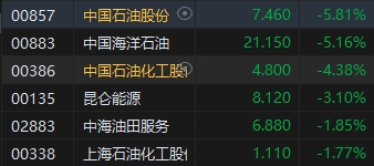 石油股全天重挫,中石油、中海油跌超5%。消息面上,國際油價繼續(xù)下行,中東局勢的緩解以及中國進口原油的下滑驅動油價走弱。隔夜布蘭特原油期貨下跌1.12美元,收于每桶83.73美元,跌幅為1.3%;美國原油期貨下跌1.15美元,收于每桶80.76美元,跌幅為1.4%。