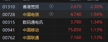 電訊服務(wù)板塊漲勢(shì)活躍,中國(guó)電信漲近2%。消息面上,摩根大通研報(bào)指出,重申對(duì)內(nèi)地三大電信股“增持”評(píng)級(jí)。該行看好中移動(dòng)收益率達(dá)7%及股息年均復(fù)合增長(zhǎng)率達(dá)7%;在波動(dòng)市場(chǎng)中的防御性高;相對(duì)于中電信及聯(lián)通,中移動(dòng)股價(jià)跑輸,具追落后潛力。該行預(yù)期內(nèi)地電信股第二季收入疲弱但盈利穩(wěn)健。