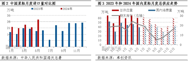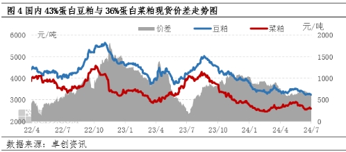 從進口和庫存數(shù)據(jù)分析來看,進口菜粕增量明顯,2024年1-5月份,我國共進口菜粕119.31萬噸,較去年同期的88.49萬噸增加34.83%;庫存數(shù)據(jù)仍處于歷年的偏高水平,至7月12日,沿海壓榨企業(yè)菜籽庫存在37.2萬噸,菜粕庫存3.95萬噸,港口進口菜粕庫存接近20萬噸。
