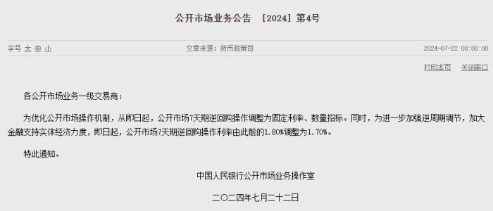 據(jù)央行網(wǎng)站消息,央行22日發(fā)布公告稱,為優(yōu)化公開市場(chǎng)操作機(jī)制,從即日起,公開市場(chǎng)7天期逆回購(gòu)操作調(diào)整為固定利率、數(shù)量招標(biāo)。同時(shí),為進(jìn)一步加強(qiáng)逆周期調(diào)節(jié),加大金融支持實(shí)體經(jīng)濟(jì)力度,即日起,公開市場(chǎng)7天期逆回購(gòu)操作利率由此前的1.80%調(diào)整為1.70%。