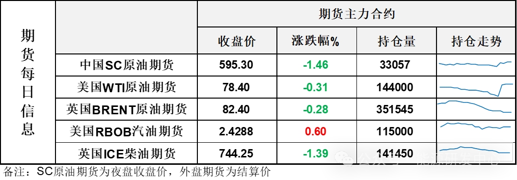 【1】WTI主力原油期貨收跌0.24美元,跌幅0.31%,報78.4美元/桶;布倫特主力原油期貨收跌0.23美元,跌幅0.28%,報82.4美元/桶;INE原油期貨收跌1.46%,報595.3元。