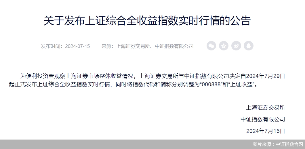 近日,據(jù)中證指數(shù)有限公司公告,為便利投資者觀察上海證券市場整體收益情況,中證指數(shù)有限公司與上交所決定自7月29日起正式發(fā)布上證收益實時行情。