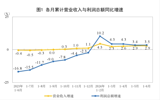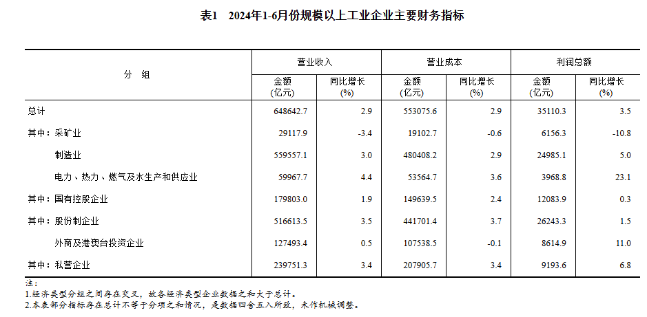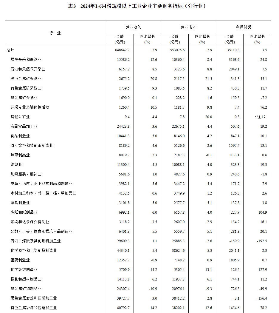 1—6月份,全國規(guī)模以上工業(yè)企業(yè)實現(xiàn)利潤總額35110.3億元,同比增長3.5%(按可比口徑計算,詳見附注二)。