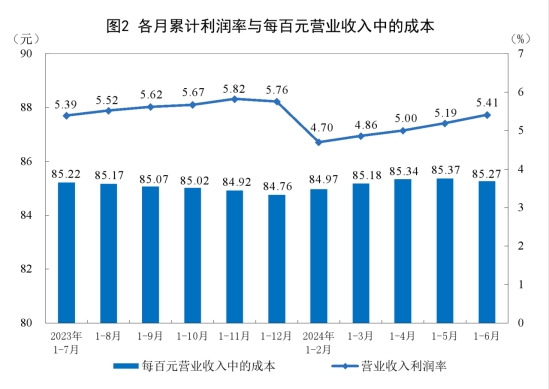 1—6月份,規(guī)模以上工業(yè)企業(yè)每百元營業(yè)收入中的成本為85.27元,同比增加0.02元;每百元營業(yè)收入中的費用為8.43元,同比增加0.05元。