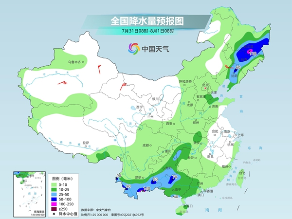 后天,黑龍江東部和南部、吉林中部、遼寧中北部、云南中南部、貴州南部、廣西西北部和南部、湖南西北部等地部分地區(qū)有大到暴雨,其中,黑龍江南部、云南南部等地局地有大暴雨。