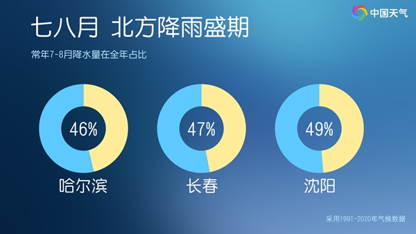 7月以來,遼寧中東部、吉林南部等地部分地區(qū)累計(jì)降水量較常年同期明顯偏多。常年7月和8月也正是東北地區(qū)降雨盛期,哈爾濱、長春、沈陽等城市這兩個月的降雨量接近全年總降雨量的一半。