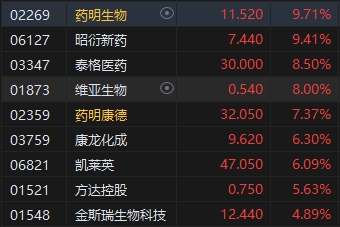 醫(yī)藥外包概念股全天漲幅居前,藥明生物漲近10%。消息面上,近期,多家CRO頭部企業(yè)發(fā)布2024年上半年業(yè)績預(yù)告,釋放出行業(yè)復(fù)蘇信號。其中,藥明康德(32.05, 2.20, 7.37%)上半年收入約172.41億元,同比減少8.6%;母公司持有者應(yīng)占溢利約42.4億元,同比減少20.2%。截至2024年6月末,公司在手訂單為431 億元創(chuàng)新高。此外,凱萊英(47.05, 2.70, 6.09%)和康龍化成(9.62, 0.57, 6.30%)同樣給出了超預(yù)期的訂單增長數(shù)據(jù)。其中,康龍化成上半年新簽訂單金額同比增長15%以上;凱萊英新簽訂單則同比增長超過20%。
