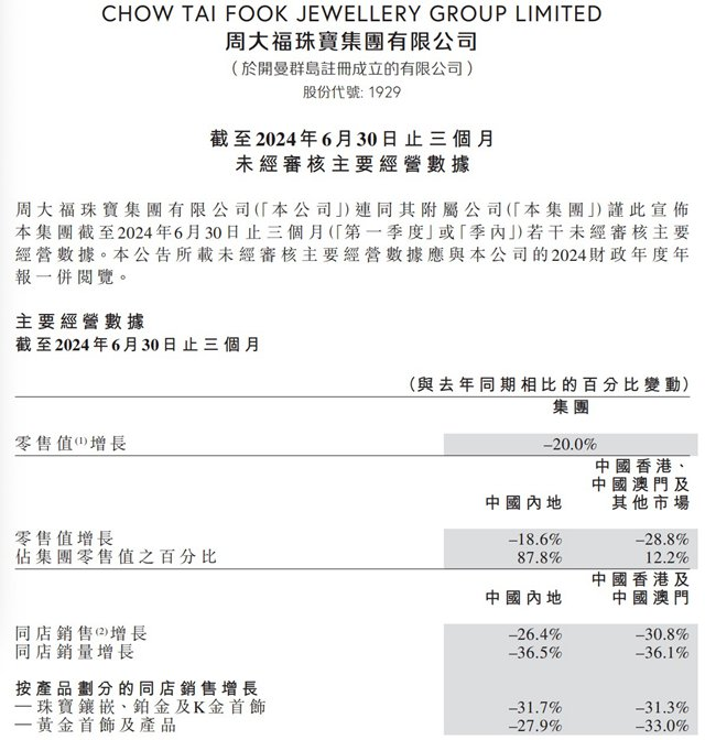 7月23日,周大福發(fā)布2025財年第一季度未經(jīng)審核的主要經(jīng)營數(shù)據(jù),截至2024年6月30日的三個月,集團零售值同比下滑20.0%,中國內(nèi)地和中國港澳分別同比下滑18.6%和28.8%。