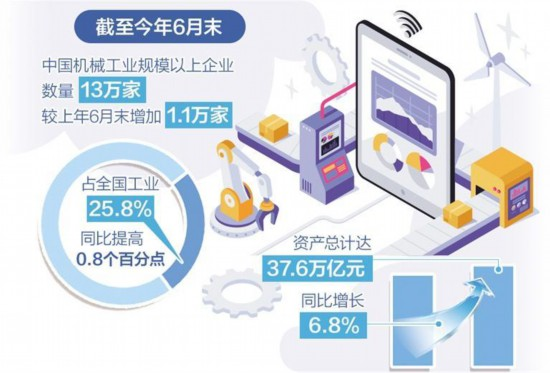 產(chǎn)業(yè)規(guī)模繼續(xù)擴(kuò)大。截至今年6月末,中國機(jī)械工業(yè)規(guī)模以上企業(yè)數(shù)量13萬家,較上年6月末增加1.1萬家,占全國工業(yè)的25.8%,占比較上年同期提高0.8個(gè)百分點(diǎn);資產(chǎn)總計(jì)達(dá)37.6萬億元,同比增長6.8%。