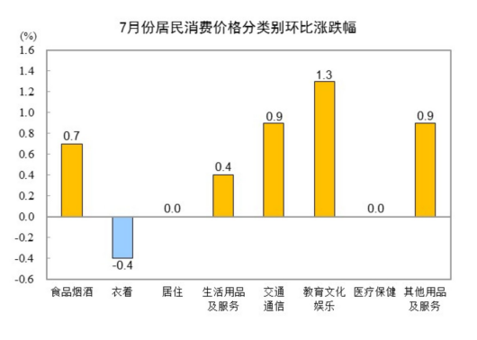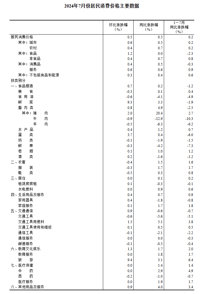 7月份,全國居民消費價格環(huán)比上漲0.5%。其中,城市上漲0.6%,農(nóng)村上漲0.4%;食品價格上漲1.2%,非食品價格上漲0.4%;消費品價格上漲0.4%,服務價格上漲0.6%。