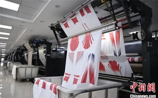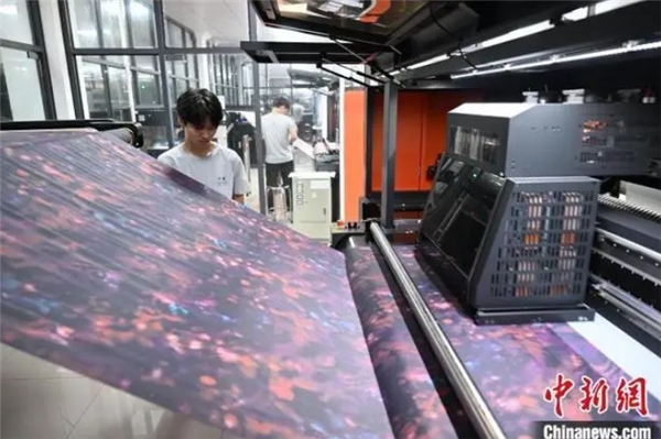 8月8日,紹興乾雍紡織有限公司內(nèi),自動(dòng)化設(shè)備正在打印加拿大體育代表團(tuán)服飾面料印花,應(yīng)對(duì)補(bǔ)單需求。該企業(yè)自2018年開(kāi)始做功能性面料,通過(guò)借力人才和科技,其設(shè)備在打印中國(guó)體育代表團(tuán)和加拿大體育代表團(tuán)服飾印花時(shí),智能算法控制的每平方米噴墨量精準(zhǔn)度達(dá)到萬(wàn)分之一毫升級(jí)別。近日,巴黎奧運(yùn)會(huì)正在舉辦中,而中國(guó)體育代表團(tuán)和加拿大體育代表團(tuán)的部分服飾,即來(lái)自于“國(guó)際紡都”浙江紹興柯橋的多家企業(yè)。8日,記者走進(jìn)柯橋,探訪這些企業(yè)的轉(zhuǎn)型發(fā)展之路,以及奧運(yùn)相關(guān)服飾產(chǎn)品的生產(chǎn)線。中新社記者 王剛 攝
