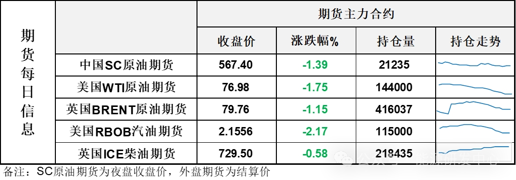【1】WTI主力原油期貨收跌1.37美元,跌幅1.75%,報(bào)76.98美元/桶;布倫特主力原油期貨收跌0.93美元,跌幅1.15%,報(bào)79.76美元/桶;INE原油期貨收跌1.39%,報(bào)567.4元。