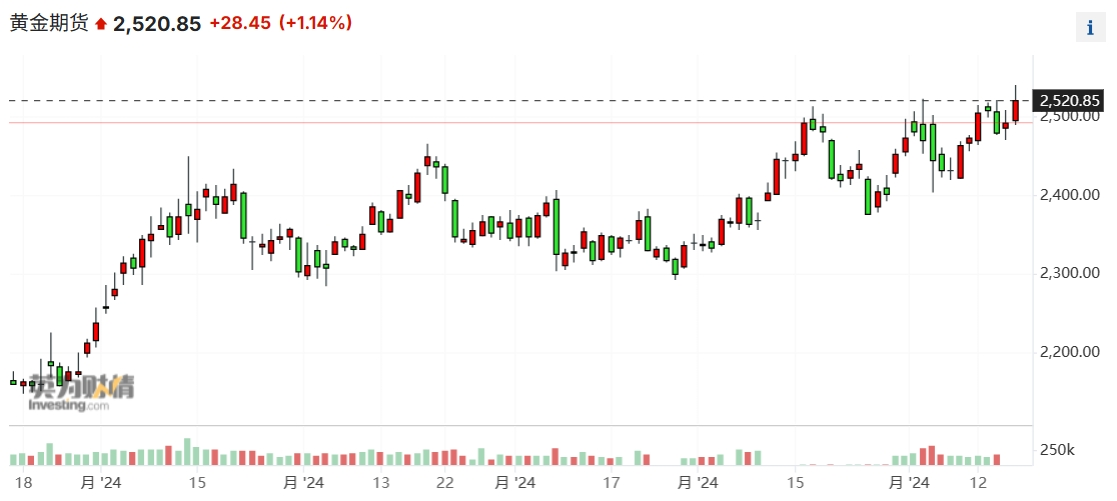 周五美盤交易時(shí)段,現(xiàn)貨黃金曾短暫突破2500美元關(guān)口,不過最新漲幅有所收窄;美國黃金期貨上漲1.1%,至每盎司2520.8美元。
