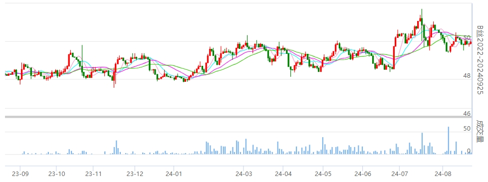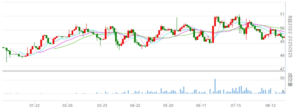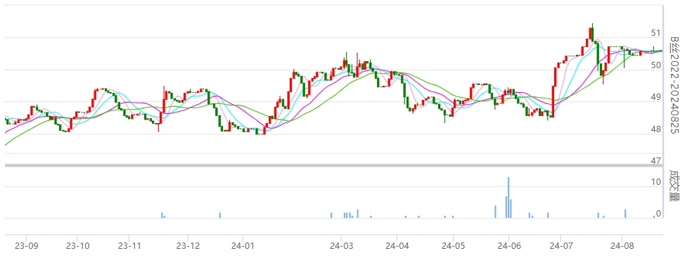 今日(2024年08月22日,周四)中國繭絲綢交易市場生絲電子指數(shù)微漲0.02%報4982.39點。B絲2022D(商檢4A級生絲):240825合約報平收于50.58萬元;240925合約上漲0.09萬元報收于49.98萬元;250325合約上漲0.03萬元報收于49.47萬元。