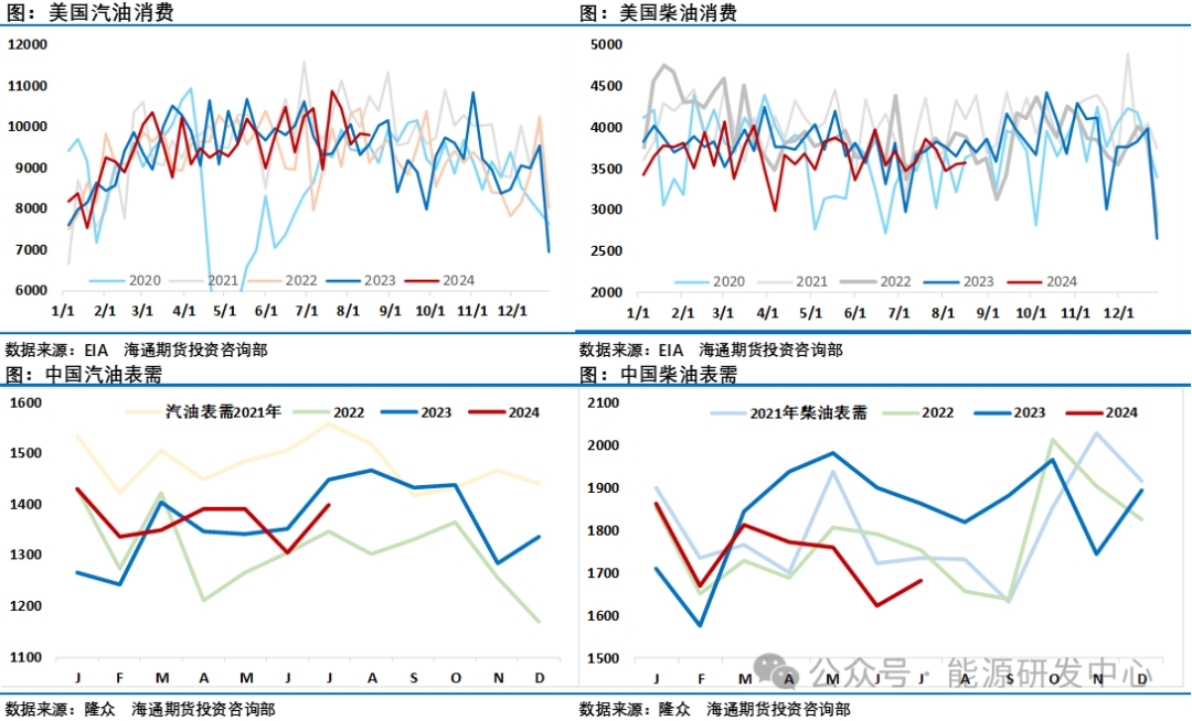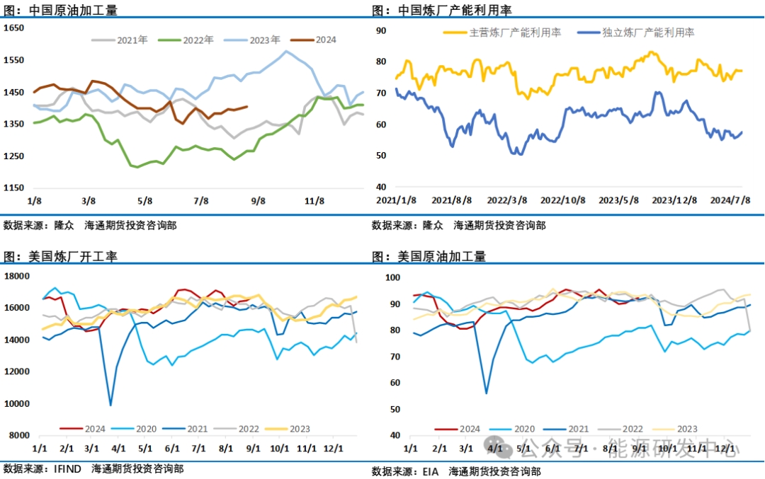 目前旺季窗口下原油市場需求環(huán)比回升,供應(yīng)還在歐佩克+減產(chǎn)期內(nèi),事實上整體庫存壓力不大,只是僅靠這一指標(biāo)已經(jīng)很難給油價帶來上行動力, 8月16日周三夜盤EIA公布的數(shù)據(jù)顯示除卻戰(zhàn)略儲備的商業(yè)原油庫存減少464.9萬桶至4.26億桶,降幅1.08%,商業(yè)原油庫存為2024年1月26日當(dāng)周以來最低,接近年內(nèi)低點。俄克拉荷馬州庫欣原油庫存同樣下降56萬桶,前值下降166.5萬桶。成品油市場方面汽油庫存下降160.6萬桶,精煉油庫存下降331.2萬桶,表現(xiàn)均好于預(yù)期,但在該數(shù)據(jù)公布后并沒有提振市場信心,油價當(dāng)天還是收跌,對庫存利多數(shù)據(jù)的麻木顯示了投資者的悲觀預(yù)期。油價表現(xiàn)疲弱非常重要的一個原因是投資者注意到原油市場需求表現(xiàn)趨弱,在地緣沒有出現(xiàn)惡化供應(yīng)擔(dān)憂降溫的情況下,這讓投資者對油價后市預(yù)期非常謹(jǐn)慎,2024年原油市場需求端表現(xiàn)將持續(xù)低于預(yù)期已經(jīng)逐漸成為明牌,尤其是中國市場需求不及預(yù)期是一個讓人擔(dān)憂的因素,不過從目前跟蹤的數(shù)據(jù)來看對中國需求的疲弱評估還不夠充分,雖然7月中國成品油表需環(huán)比反彈,但最大的問題是同比仍是有很大的缺口,從中國原油加工量來看,今年一二三季度是非常明顯的同比逐步下行趨勢。而美國市場年內(nèi)消費峰值已過,從季節(jié)性走勢來看接下來美國原油加工量和油品消費都將從年內(nèi)高點回落。中國傳統(tǒng)的金九銀十能否帶來驚喜成為產(chǎn)業(yè)年內(nèi)最后的機(jī)會,從目前進(jìn)展來看需求有所增加,最近原油加工量也穩(wěn)步反彈,但還是與去年同期差距明顯。