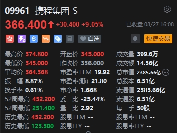 旅游股全天漲幅居前,攜程績(jī)后漲超9%。消息面上,攜程集團(tuán)發(fā)布2024年第二季度及上半年業(yè)績(jī)。今年二季度,該公司取得收入合計(jì)人民幣127.88億元,同比增長(zhǎng)13.55%;股東應(yīng)占溢利38.33億元,同比增長(zhǎng)507.45%。上半年,公司取得收入合計(jì)247.09億元,同比增長(zhǎng)20.69%;歸屬攜程集團(tuán)有限公司凈利潤(rùn)81.45億元,同比增長(zhǎng)103.32%。